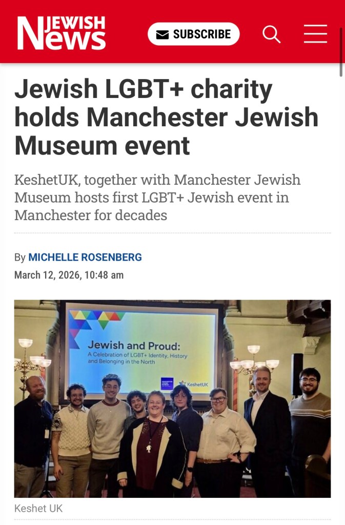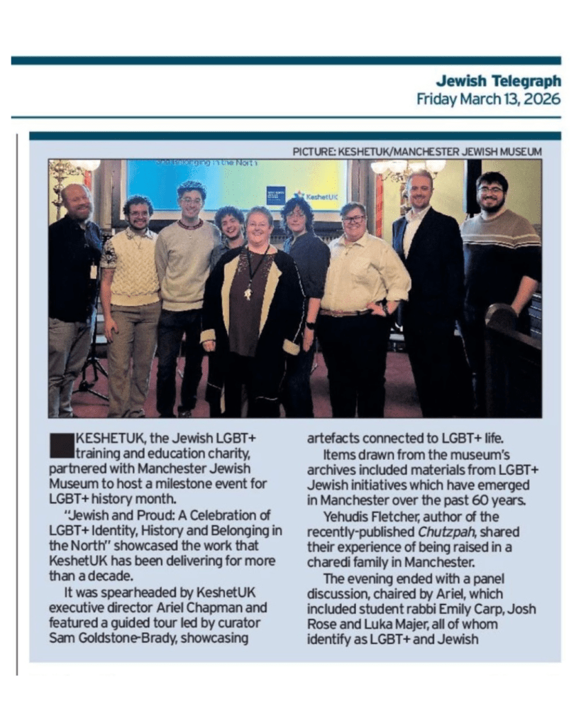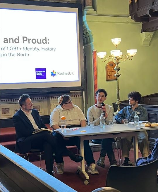 Josh speaking on a panel at the Manchester Jewish Museum in February 2026 as part of LGBT+ History Month. KeshetUK invited Josh to speak about growing up in Manchester as a gay Jew for their ‘celebration of LGBT+ identity, history and belonging in the north’ event.