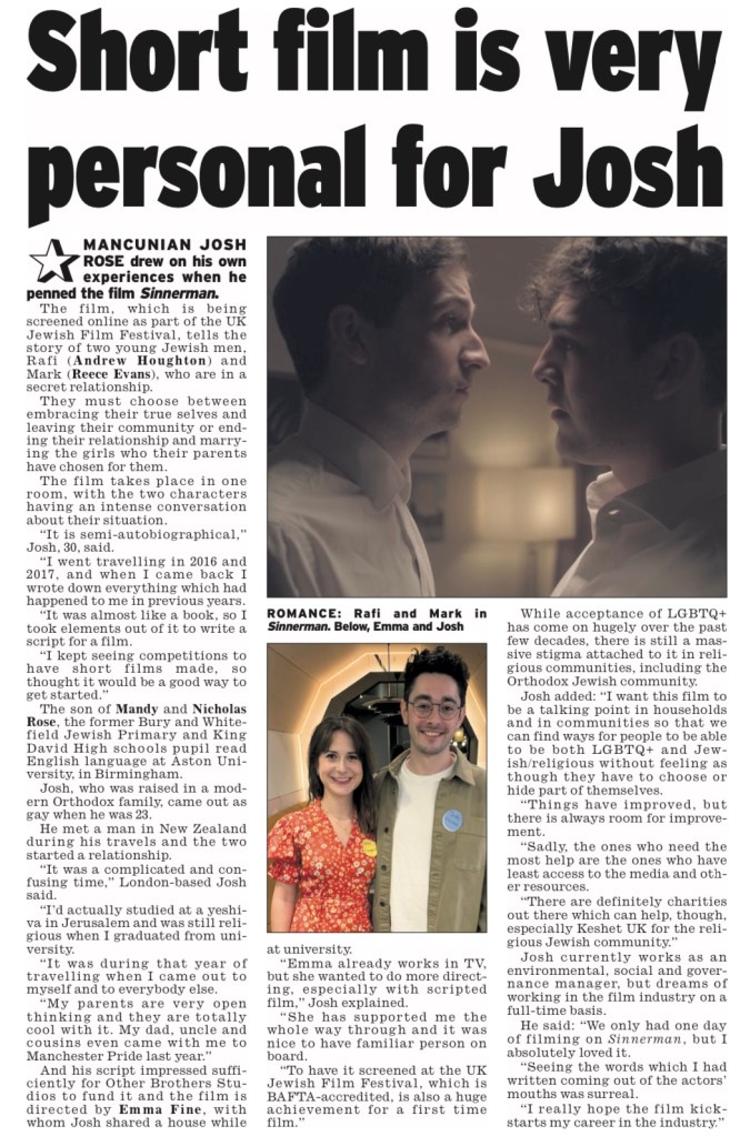 Sinnerman, written and created by Josh Rose, is a coming-of-age drama centred around two young Jewish men who face the tough decision of whether to embrace their secret relationship and leave their community, or end their relationship and marry the girls that their parents have chosen for them.